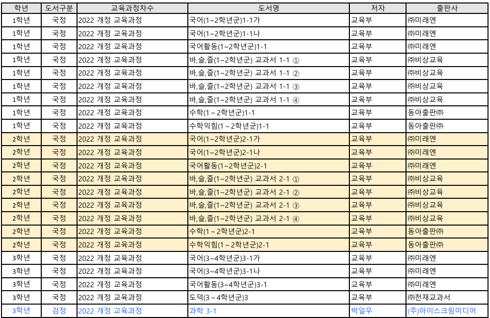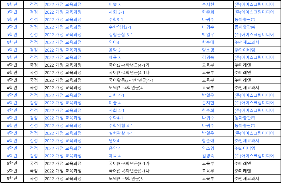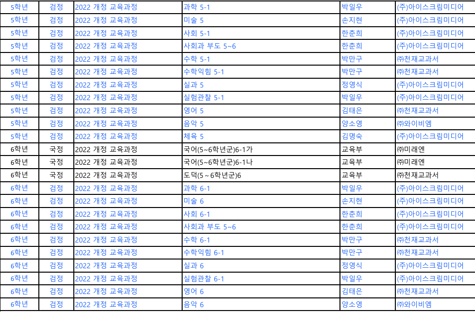 국정이 아닌 검정 교과서는 각 학교마다 출판사가 상이하므로,